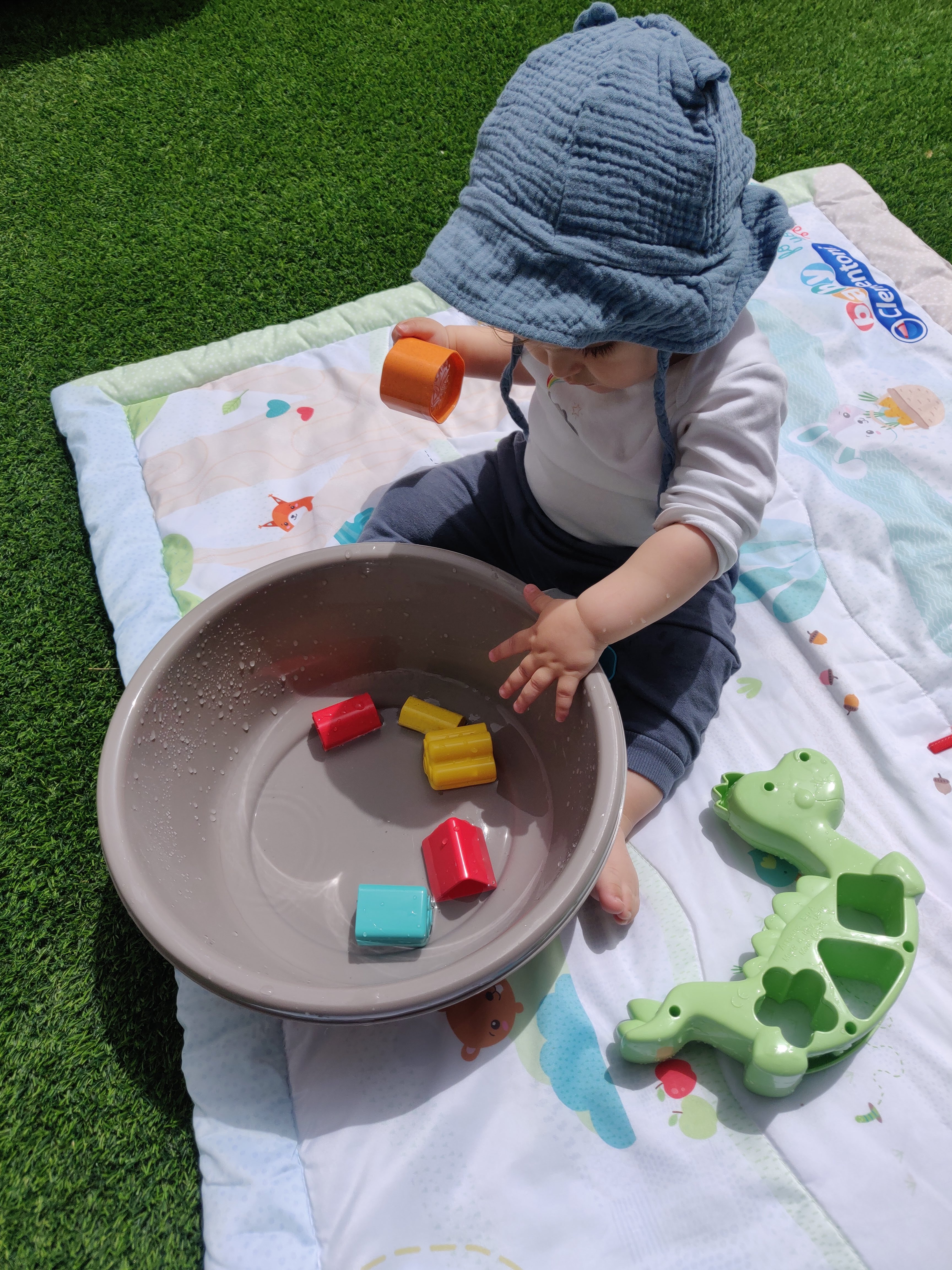 And if you don’t have enough space or don’t want to use so much water, you can always take a regular plastic basin or bowl, some toys, and a small playmat and have some splashy watery fun like that instead!